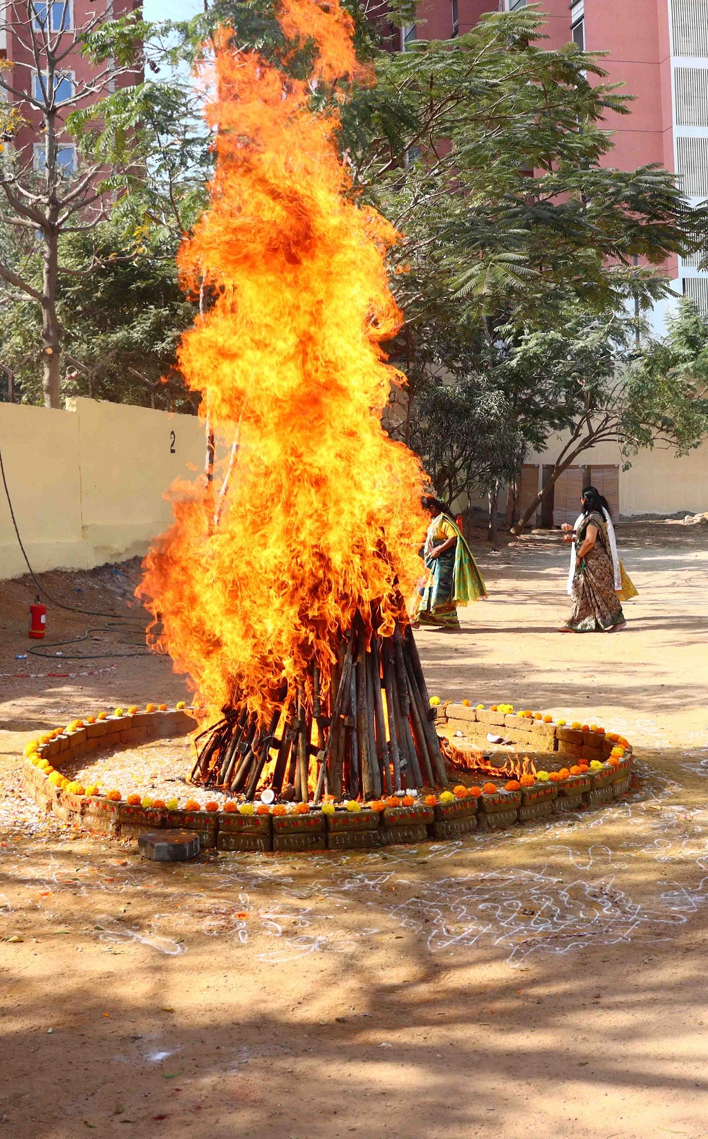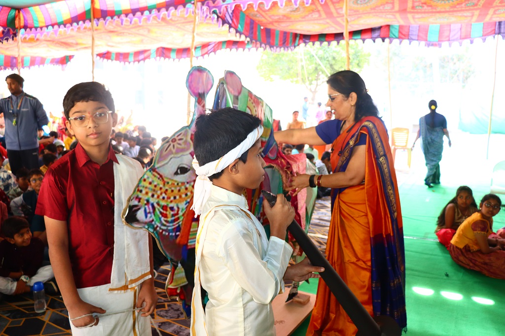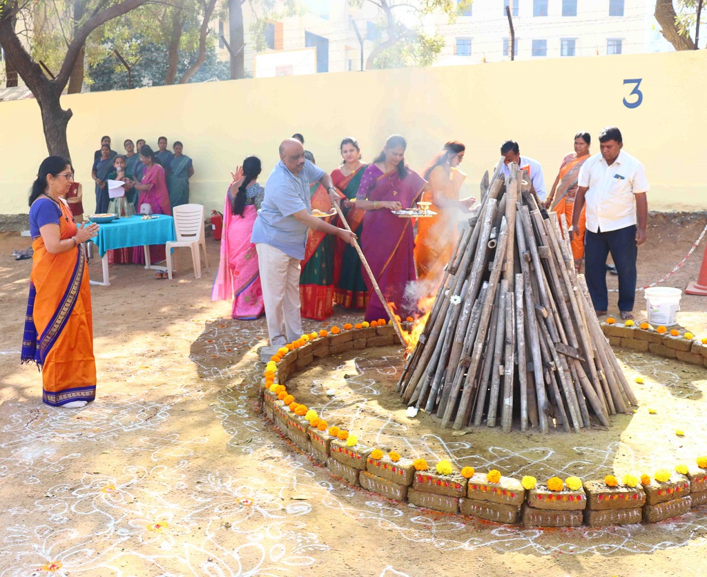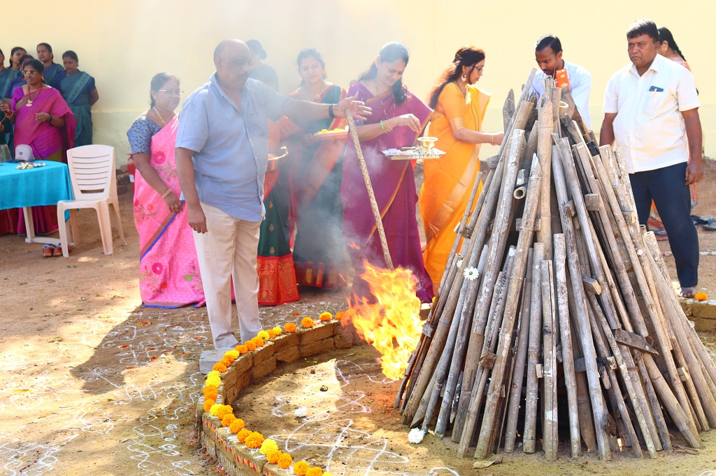 Smt. Rajyalaxmi Bhat inspiring words encouraged students to stay rooted in tradition while confidently embracing the future, reinforcing the values upheld by the institution. The celebrations began on an auspicious note with “Kumba Swagatham”, where students extended a traditional and graceful welcome to the dignitaries. A ceremonial bonfire (Bhogi Mantalu) lit up the surroundings, symbolizing the burning away of the old and the welcoming of new beginnings.
